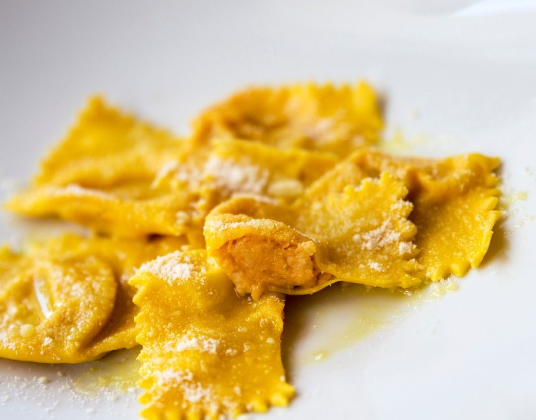 Il menù include specialità della cucina mantovana, come i tortelli di zucca, insieme a piatti della tradizione italiana a base di carne e pesce.